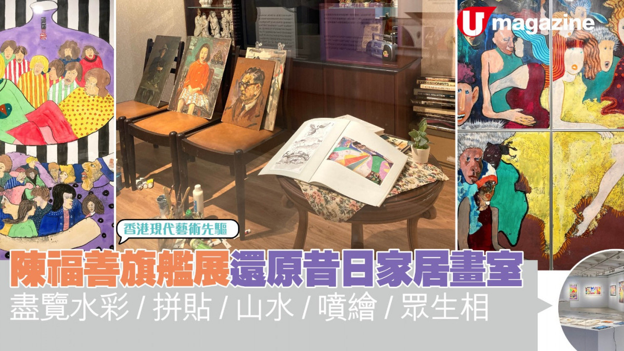 ▌陳福善旗艦展覽香港藝術中心包氏畫廊舉行。▌展覽展出了陳福善一生不同階段的創作。 ▌陳福善早期畫水彩風景畫為主,被譽為「水彩王」。▌拼貼畫系列。▌魚系列畫。▌畫中人物表情可見香港歌舞昇平背後的社會矛盾。▌還有展示了陳福善的著作。畫廊更還原了陳福善當年居住在灣仔的家居畫室,可親眼看到他的藏書、家居擺設、畫具、手稿等,將他作畫時的情景活現在眼前。