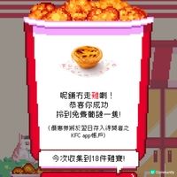 另外,KFC App 由即日起至4月28日期間,特別加入全新有趣的手機小遊戲。用戶參與好玩遊戲同時,更有機會贏得豐富獎品。KFC一連2星期每日送出 3000 個葡撻。只要於當日下午3時起,成為頭3000位贏家即可免費獲贈葡撻,齊齊爭奪幸運兒資格喇!只要擠身每周頭10位最高分參加者,即可贏取全年免費食雞的終極大獎(每份大獎為$26,000 外賣現金券)。