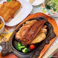 兩塊雞扒煎得外脆內嫩,又有一整條鰻魚,外皮帶有微微焦香,魚肉柔嫩帶化,醬汁鹹甜滋味,還另上蒜蓉汁及薯菜,跟配蒜蓉牛油多士、羅宋湯及熱飲一杯。