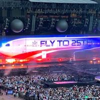 🎤五月天5525回到那一天香港演唱會的舞臺設計充分利用場館空間。開場以「FLY TO 25TH」飛機降落短片揭幕,巨型五球舞台綻放紅、黃、藍等鮮艷燈光,與歌曲《派對動物》同步閃爍,點燃全場熱情。歌單以經典《知足》《戀愛ING》為主,搭配新歌,勾起25年回憶。舞台機關流暢,中央大螢幕與五球燈光互動,視覺層次豐富。正面視角完美,近距離感受阿信的深情演唱與怪獸的吉他solo,互動環節溫馨,粉絲應援螢光棒形成絢麗燈海。整體而言,首場演出氣勢磅礡,場館設施新穎,令人期待後續! #啟德主場館視角 #演唱會視角