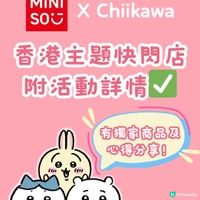chiikawa強勢登陸香港!chiikawa各個卡通外表可愛,亦因性格各有個人特色而深受年輕人喜愛。而MINISO有見及此更與Chiikawa聯乘合作,由即日起至7月11日在九龍塘又一城開設主題快閃店,並推出了大量chiikawa卡通周邊,期間限定發售超多款獨家產品,千萬不要錯過!