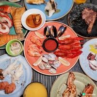 凍海鮮及頭盤:龍蝦、鮑魚、阿拉斯加皇帝蟹腳、麵包蟹、雪蟹腳、海螺、青口、蝦、刺身、沙律、芝士盤