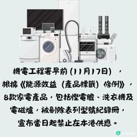 機電工程署今日(17日)根據《能源效益(產品標籤)條例》,宣布將合共8款家電,包括緊湊型熒光燈(慳電膽)、洗衣機及電磁爐從《條例》訂明的表列型號紀錄冊中剔除,即日起不得在本港供應。