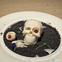 前菜及主菜之後,當然係甜品,骷髏頭的椰汁布甸,放在竹炭曲奇之上,顯得有點詭異。