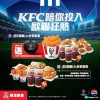 歐聯賽事進行得如火如荼,睇波點少得食宵夜,KFC 與 Pepsi 聯乘合作,推出「歐聯 3 人分享套餐」,陪伴一眾球迷歡渡賽事,隨餐附送 1 個百事 x 歐聯限量版紀念足球(5號)及紙袋。