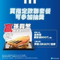 另外,現凡購買「歐聯 3 人分享套餐」或「歐聯 2 人分享套餐」即可參加抽奬,贏取由球星「孫興慜」親筆簽名波鞋(1 隻)(名額 1個) 或二獎 KFC 禮券$500 (名額 10 個)。購買一份指定套餐可獲一次抽獎機會,兩份可