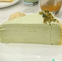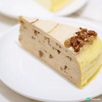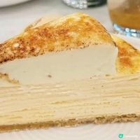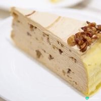 杜拜朱古力千層蛋糕頂層鋪滿以開心果醬混合於切碎的Kataifi(中東的特色小麥細麵),香濃酥脆,並以一圈精緻的朱古力鮮忌廉裝飾。蛋糕則以朱古力口味的手工班戟皮層疊而成,蛋糕上半部分搭配開心果鮮忌廉,下半部分則搭配朱古力鮮忌廉,口感層次豐富!