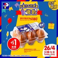 在4月26日當天,顧客於香港百佳及旗下門市或PNS網購*購物滿$180,即可加$1換購1盒6隻超值牌新鮮啡蛋特大裝^(價值$9.9),限量50,000盒!(*GREAT FOOD HALL 除外,^數量有限,換完即止)。
