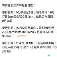 - 10月4日、10月18日及11月8日: 中午12時開始(廣東話團)