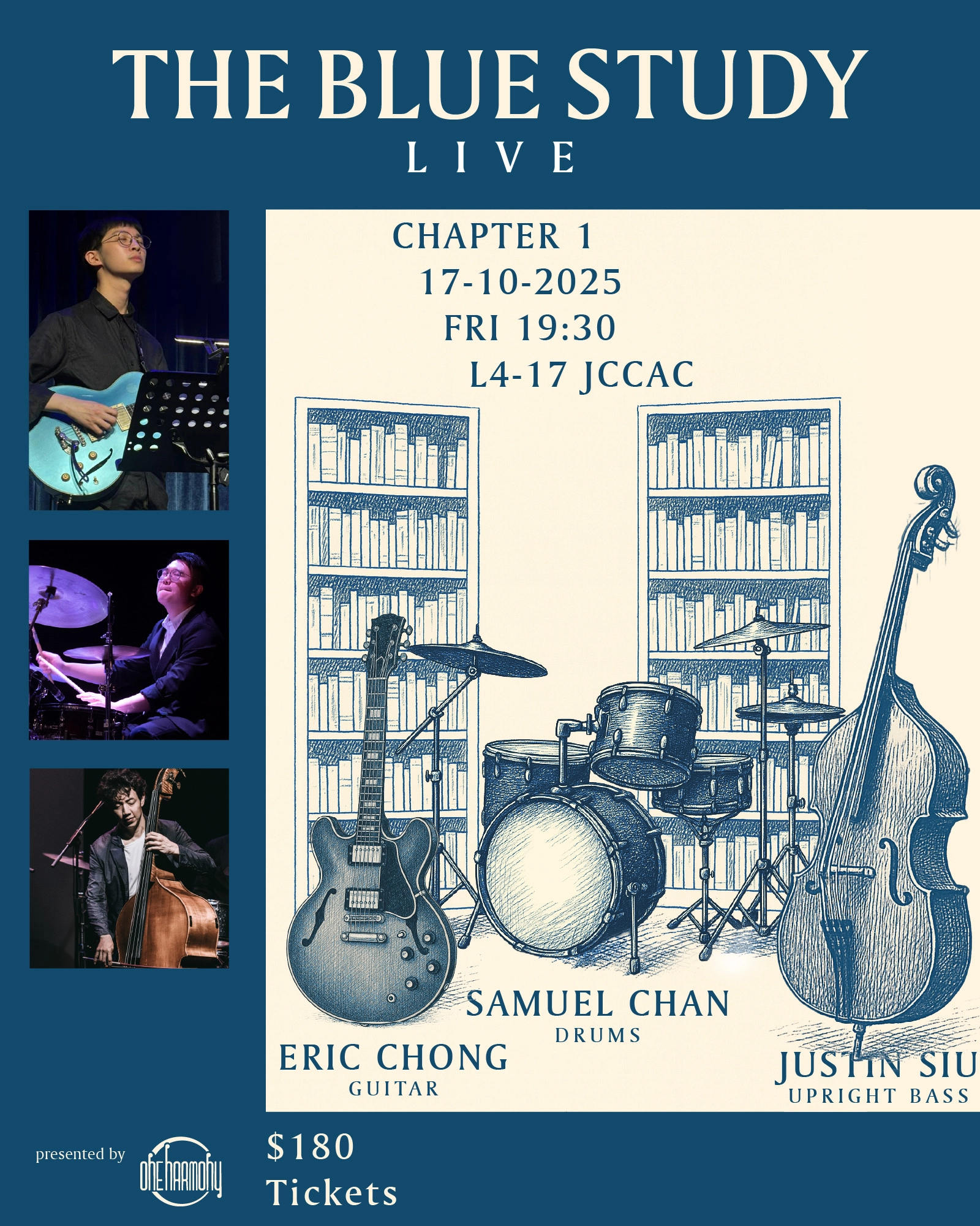 繼首場由 Ted Lo 主演的開幕演出後,The Blue Study Live 將帶來全新組合的音樂對話。結他手 Eric Chong 與鼓手 Samuel Chan,以及低音提琴手蕭偉中將共同呈現。Eric Chong 是香港爵士結他手及作曲家,曾參與亞洲與歐洲多個國際音樂節。Samuel Chan 是首位以爵士音樂主修畢業的香港音樂人,並曾於紐約深造,與世界級音樂家合作。這場演出將展現細膩的互動與即興演奏,帶來一場精緻且充滿活力的爵士之夜。