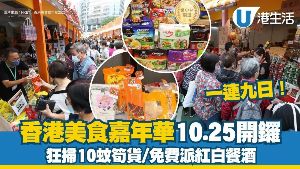 2025美食嘉年華於10月25日正式開鑼!今年除了新增「家鄉風味區」,大會更推出三重購物優惠,包括「震撼開鑼優惠」、「閉幕必買優惠」,以及全新的「10蚊開心購」,碗仔翅、頂級臘鴨髀、小麥草海燕窩等多款精選產品一律以$10發售!與此同時,每日2個指定時段更會免費送出紅白餐酒,大家切勿錯過啦!