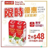 明治頂級鮮牛奶946毫升 $52/2盒,折實價 $39/2盒,平均每盒$19.5。yuu會員購買任何牛奶飲品946毫升,更可獲取7仔yuu 印花 1個, 儲齊5個yuu印花即送 1盒。