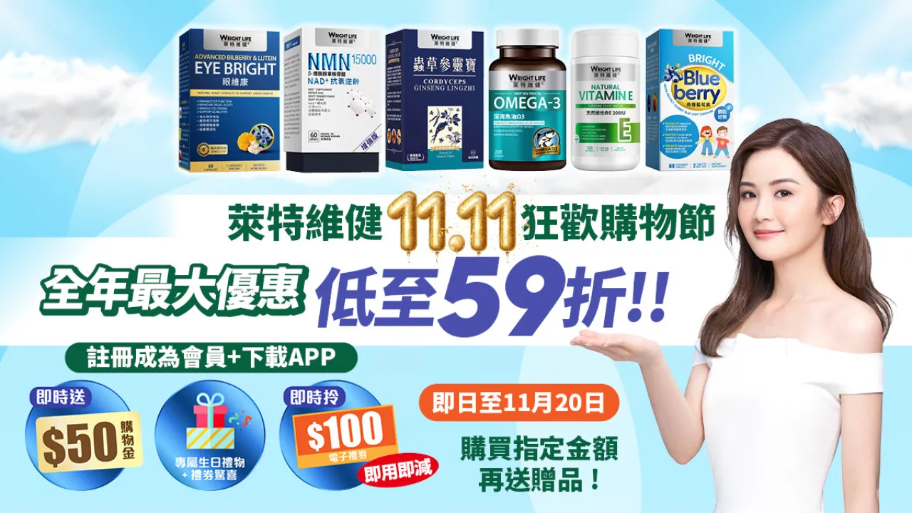 雙11已經準備好大手買衫買家電家俬?不如趁住轉季,學識精明消費,為自己同屋企人的健康補補倉。萊特維健(Wright Life)推出年度最大優惠「11.11狂歡購物節」,10月31日至11月20日,全店精選產品3件7折,多款人氣產品更有買2送1及福袋特別優惠!優惠多到花多眼亂?即刻為你整合最強慳錢攻略,跟住買唔怕走寶!