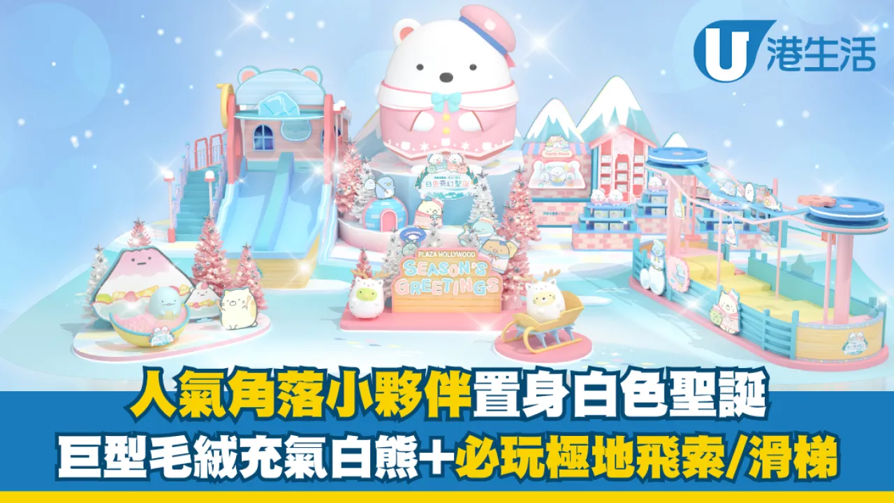 日本超人氣卡通 Sumikkogurashi 角落小夥伴來到香港啦!今個聖誕一眾可愛的角落生物於荷里活廣場打造「白色奇幻聖誕」,當中有2大必玩的「冰雪極地飛索」及「冰極冒險滑梯」專區,以及6大節日主題打卡位。首次亮相的5米高白熊「Shirokuma」巨型毛絨充氣裝置,非常矚目又可愛!
