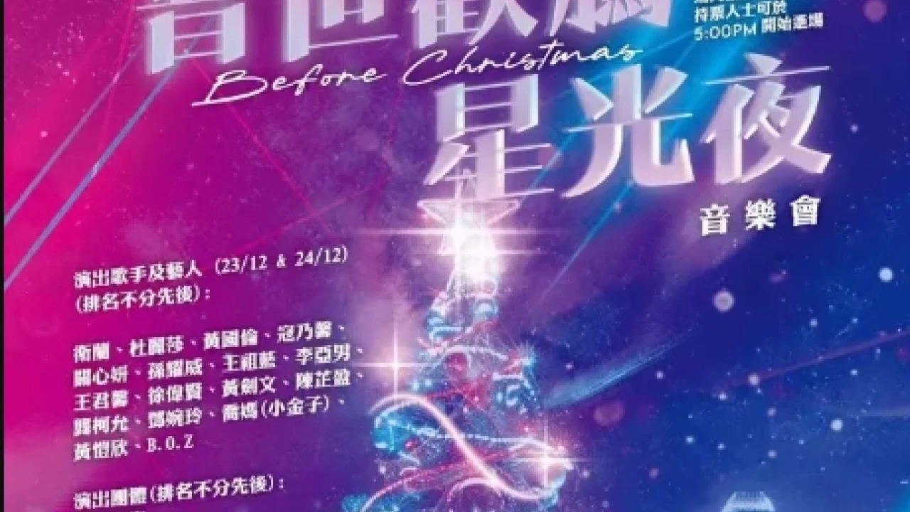 藝人之家40周年呈獻的「普世歡騰星光夜」音樂會,將於12月23日及24日晚上在西九文化區竹翠公園AXA x Wonderland舉行。音樂會將於晚上8:00開始,持票人士可於下午5:00進場,場內設有聖誕市集。屆時,超過20個演出單位將以歌聲頌揚,來自香港及世界各地的觀眾將聚集於此,一同經歷一場集「信」、「望」、「愛」的旅程。參與演出的藝人包括衛蘭、杜麗莎、黃國倫、寇乃馨、關心妍、王君馨、孫耀威、王祖藍、李亞男、徐偉賢、黃劍文、陳芷盈、龔柯允、鄧婉玲、喬媽、黃愷欣、B.O.Z、讚美之泉、Eternity Music Ministry、玻璃海樂團、藝人之家歌手小組,以及王菀之、車婉婉和衛詩。