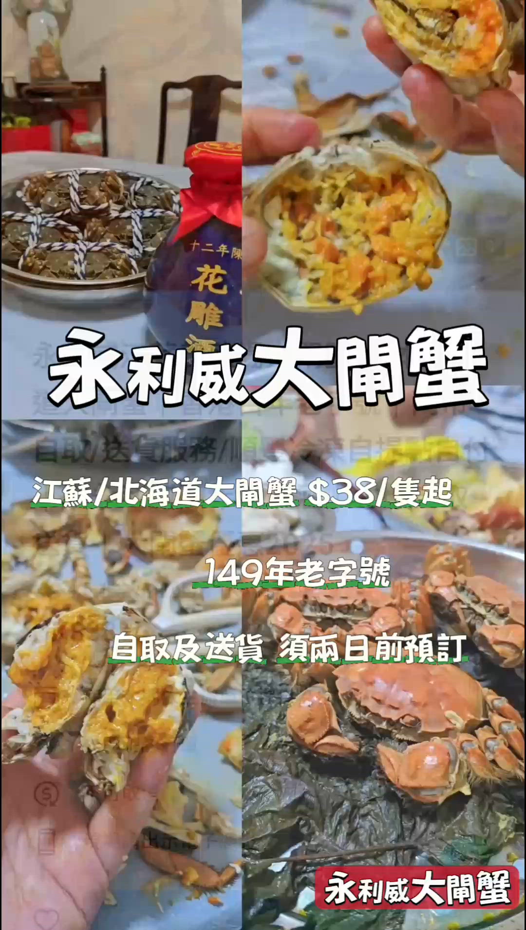 大閘蟹|大閘蟹優惠|買一送一|鍾意食大閘蟹的朋友有食神喇!149 年香港老字號「 永利威」突發大閘蟹買一送一,江蘇養殖場大閘蟹及北海道大閘蟹都有折,最平$115/隻。江蘇大閘蟹黃脥膏鮮,較香濃;北海道大閘蟹蟹黃入口鮮甜香滑,蟹膏結實濃郁,大家可以因應自己口味揀選。