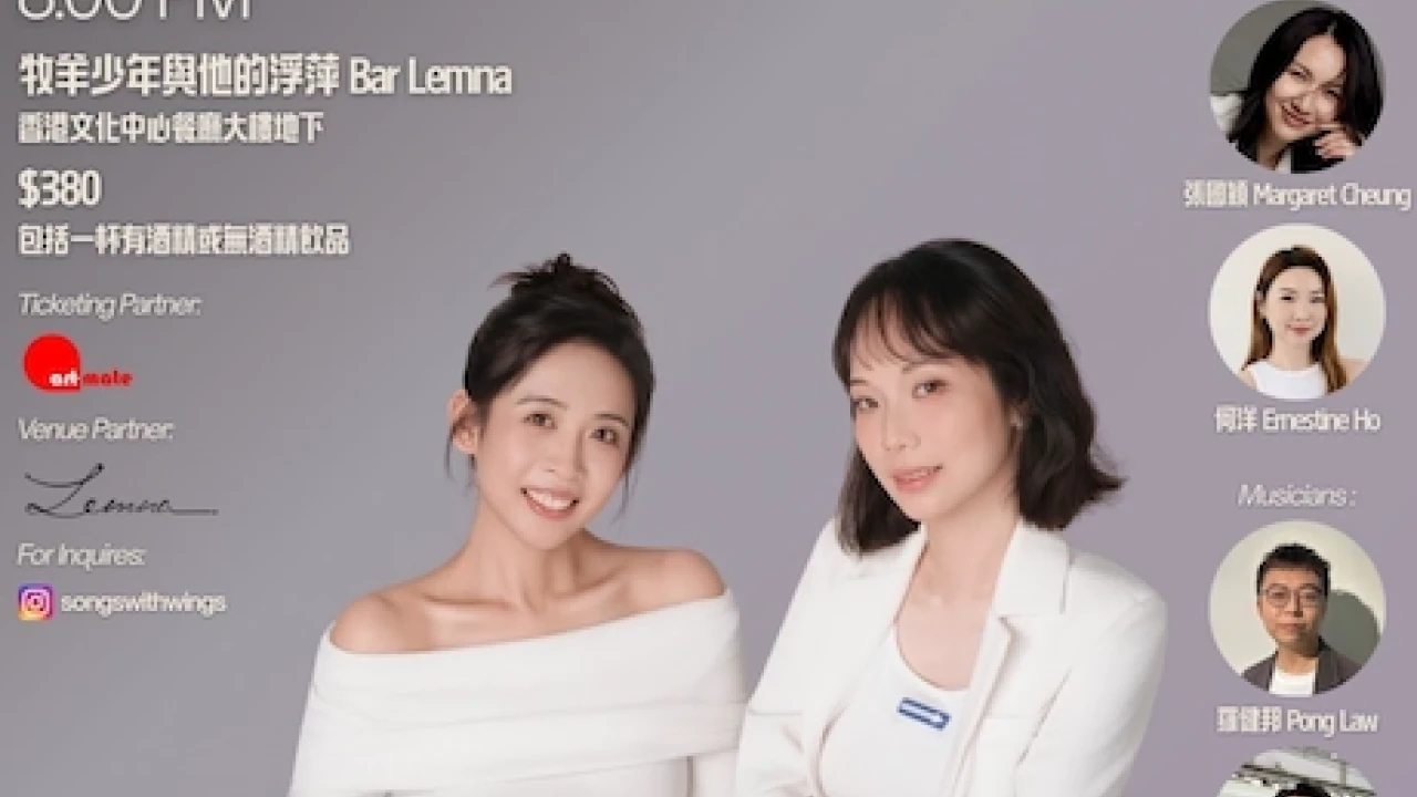 黃旨穎 x 唐家穎 "Songs with Wings" 音樂劇作品音樂會香港|群星將於2025年12月08日在Lemna of the Alchemist - Bar Lemna舉辦 黃旨穎 x 唐家穎 "Songs with Wings" 音樂劇作品音樂會,U Lifestyle為大家整合 黃旨穎 x 唐家穎 "Songs with Wings" 音樂劇作品音樂會日期、場地、優先購票、公開發售日期及門票等詳情。大家務必留意,確保不會錯過 黃旨穎 x 唐家穎 "Songs with Wings" 音樂劇作品音樂會的活動詳情!