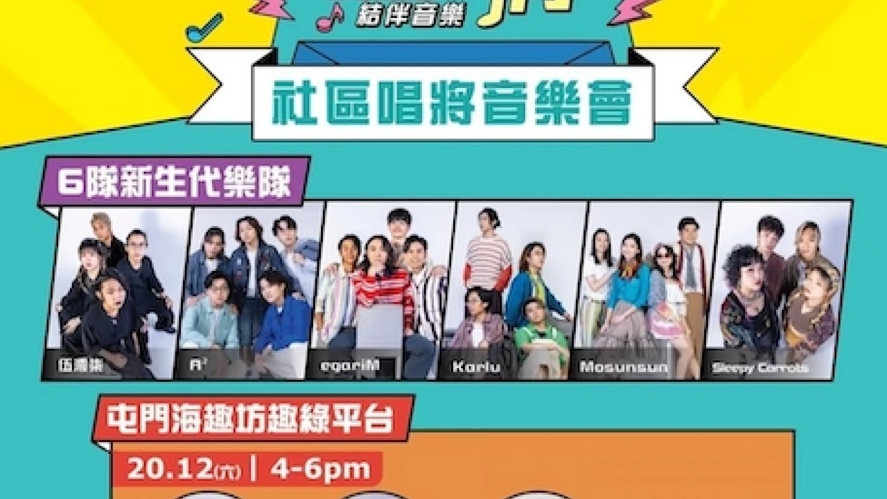 海趣坊將於12月尾舉辦兩場音樂會。音樂會將有六支新生代樂隊,包括伍澪柒、A²、egariM、Karlu、Mosunsun,以及Sleepy Carrots。這些樂隊是從港鐵商場聯同協青社蒲吧舉辦的「社區唱將」中挑選出來的。他們曾接受Kolor羅斌和ToNick晨曦兩位導師的訓練,並將在海趣坊表演。除了這六支樂隊,麗英、Rover、黎展峯、黃明德、KOLOR及The Hertz也將參與演出。