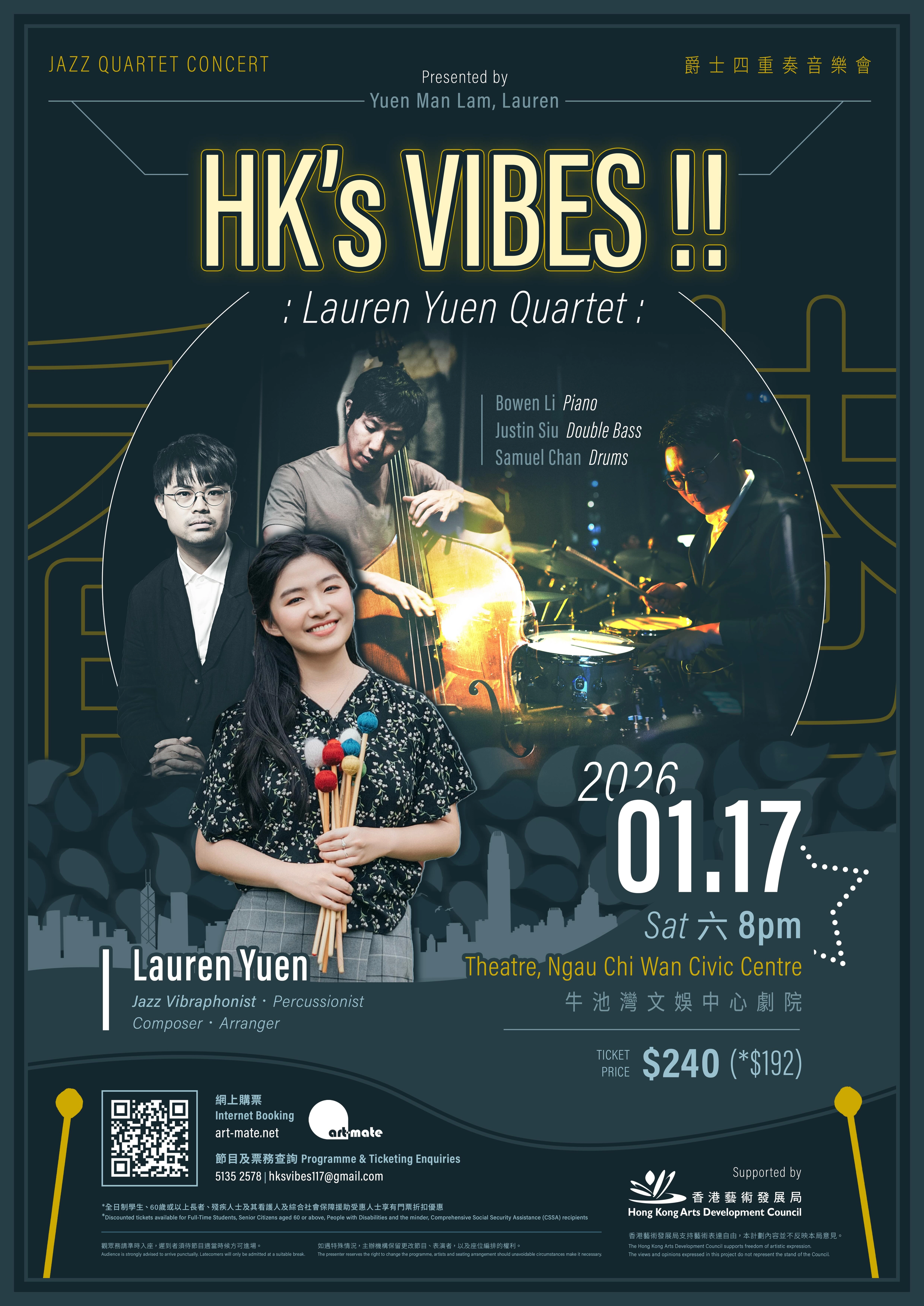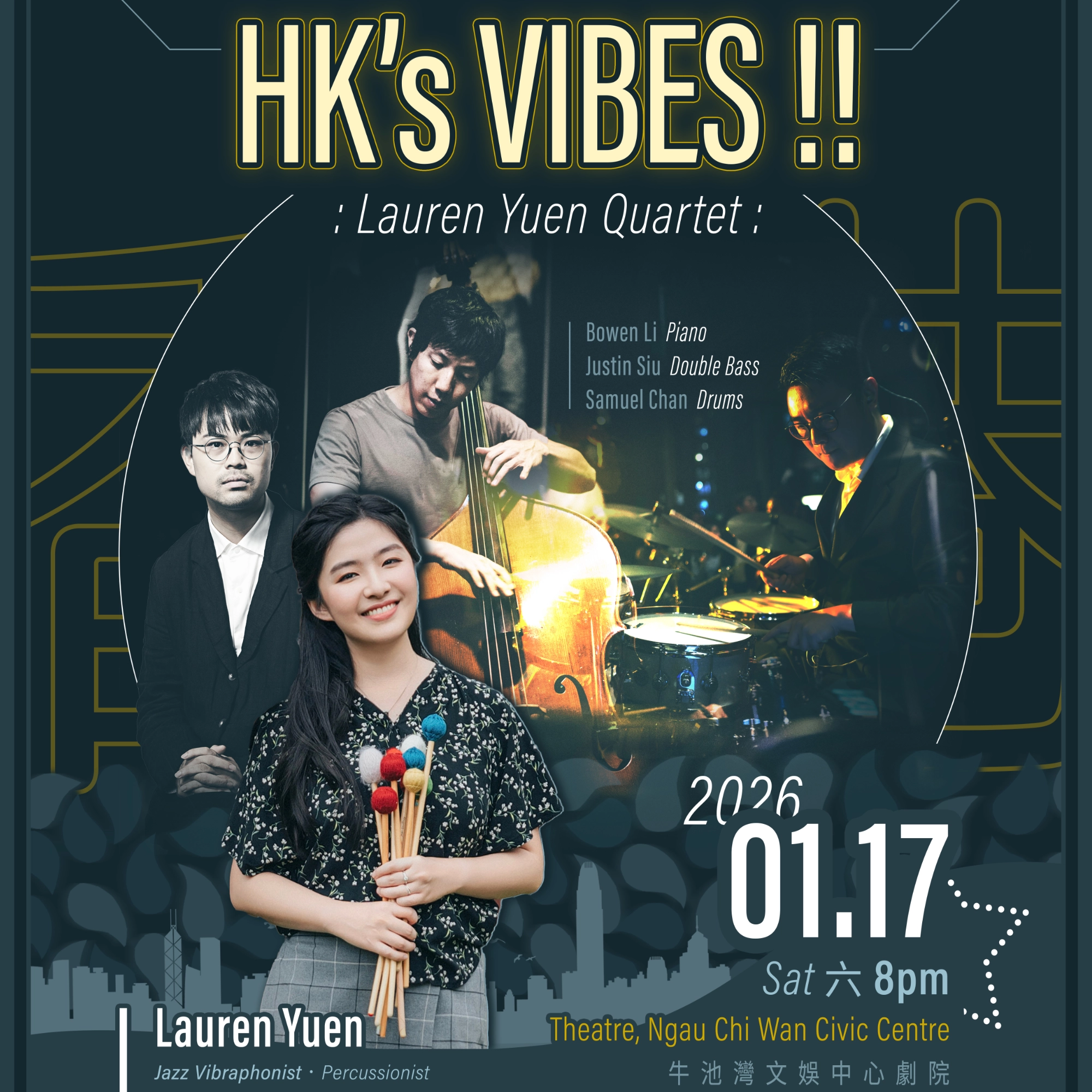 HK's VIBES!! 是一場爵士四重奏音樂會,以爵士顫音琴與原創音樂為主題。「Vibes」既是「顫音琴」(vibraphone)的簡稱,也象徵「氛圍」— 香港的風格與氛圍。作為土生土長的音樂家,演奏者將透過創作、編曲並演奏十首作品,以描繪香港的「氛圍」。憑藉其「古典音樂背景的爵士顫音琴演奏者」的獨特身份,將在不同的打擊樂器上演奏與即興,讓觀眾沉浸於打擊樂器多變的音色之中。透過爵士即興,觀眾將被帶入一段精彩的旅程,感受現場即興音樂中獨特的火花與化學作用。節目全場90分鐘,適合6歲或以上人士。