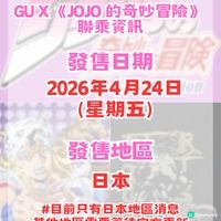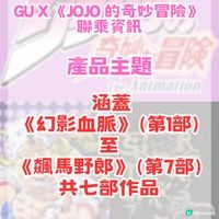 各位 動漫迷、JOJO 迷、重量級消息要宣佈! GU 已經宣佈同傳奇級作品《JOJO 的奇妙冒險》推出超強聯乘! 今次仲要喺首次合作! 而系列涵蓋咗多部作品嘅經典元素,設計仲要充滿時尚感! 依家就為香港嘅 動漫迷同埋JOJO 迷 推薦 10 個最值得入手嘅產品! 📅  GU X JOJO 的奇妙冒險 聯乘資訊(P2-P3) 發售日期: 2026年 4 月 24 日 (星期五) 起發售。 發售地區:日本地區 (目前只有日本地區消息,其他地區需要等待官方更新) 主題: 涵蓋《幻影血脈》(Part 1) 至《飆馬野郎》(Part 7) 共七部作品。 🏆 10 大產品推薦 (10 大產品資訊及售價請睇圖P5-P20) (相片及資料來自於日本GU) 1. 《JOJO 的奇妙冒險:星塵遠征軍》 承太郎 T-Shirt 三部作為人氣最高嘅一章,今次設計當然唔會令大家失望。充滿迫力嘅圖案,將承太郎美呈現。 2. 《JOJO 的奇妙冒險:星塵遠征軍》DIO T-Shirt 作為超有魅力嘅反派,今次將DIO嘅背肌感完美呈現。 3. 《JOJO 的奇妙冒險: 幻影血脈》石鬼面 T-Shirt 一切傳奇嘅開端!印有初代 JOJO 嘅經典「石鬼面」圖案 4. 《JOJO 的奇妙冒險:黃金之風》喬魯諾 T-Shirt 以五部主角嘅圖案為重心,色彩搭配充滿義大利風情。 5. 《JOJO 的奇妙冒險:石之海》杜王町T-Shirt 以徐倫及替物為代表圖案。 6. 《JOJO 的奇妙冒險: 不滅鑽石》杜王町T-Shirt 以第4部主要角色相關元素設計,鍾意杜王町嘅粉絲唔好錯過。 7. 《JOJO 的奇妙冒險: 戰鬥潮流》喬瑟夫T-Shirt 以二部主角嘅美式幽默風格為基調,充滿懷舊感。 對於鍾意波紋疾走時代嘅老粉嚟講,呢件係情懷之選。 8. 《JOJO 的奇妙冒險:星塵遠征軍》伊奇 短袖恤衫 恤衫充滿咗伊奇圖案 9. 《JOJO 的奇妙冒險:飆馬野郎》 短袖恤衫 充滿星星圖案,印上馬匹的代表圖案 10. 《JOJO 的奇妙冒險:飆馬野郎》傑洛·齊貝林 T-Shirt 第7部另一位主角圖案 《JOJO 的奇妙冒險:飆馬野郎》第7部作品資訊 (P21-P23) 上畫日期:2026年3月19日 上畫平台:Netflix(獨家限定) 第1集仲要加長至47分鐘!! 圖片來源:X@anime_jojo、gu_global Official website@gu-global #攻略 #動漫 #JOJO 的奇妙冒險 #日本攻略