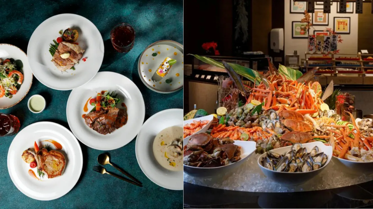 海洋公園萬豪酒店自助晚餐買1送1,人均$467起。3.5小時任食清蒸波士頓龍蝦、北京片皮鴨、蒜蓉牛油焗蟹,及燒美國安格斯斧頭扒。同時還有燒烤自助晚餐買1送1,人均$401。3.5小時任食鱈場蟹腳、波士頓龍蝦,及烤西班牙原隻乳豬。