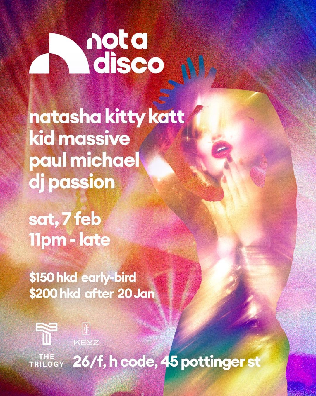 "Not A Disco Presents: Natasha Kitty Katt, Kid Massive, Paul Michael and more" 音樂之夜香港|群星將於2026年02月07日在The Trilogy舉辦"Not A Disco Presents: Natasha Kitty Katt, Kid Massive, Paul Michael and more" 音樂之夜,U Lifestyle為大家整合"Not A Disco Presents: Natasha Kitty Katt, Kid Massive, Paul Michael and more" 音樂之夜日期、場地、優先購票、公開發售日期及門票等詳情。大家務必留意,確保不會錯過"Not A Disco Presents: Natasha Kitty Katt, Kid Massive, Paul Michael and more" 音樂之夜的活動詳情!