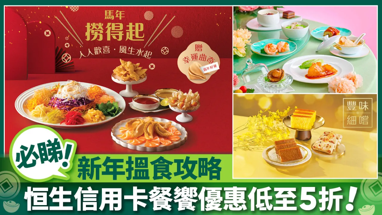 新一年要大吉大利,喺時候要約齊親朋好友食開運團年飯🍚同買賀年糕品。恒生信用卡為大家準備咗超級豐富嘅餐饗優惠,應節中菜、酒店自助餐、滋味套餐、賀年糕品等一應俱全,無論是農曆新年家庭聚餐,同摰愛浪漫撐檯腳,抑或是三五知己歡聚一齊歎🤩,都可以滿足大家嘅味蕾!