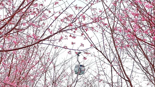 位於大帽山北坡的嘉道理農場,擁有多棵鐘花櫻桃,花色紫紅,花形呈傘狀。春日微風中,櫻花搖曳生姿,與自然景觀交相輝映。