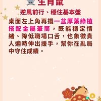 丙午馬年來勢猛烈,職場節奏明顯加快,有人順勢奔騰、一路高升,也有人感覺壓力山大、步步驚心。想在變動之年穩住官祿運、打開升遷財路,除了實力要到位,「辦公室風水」更是不可忽略的輔助力。想知道如何提升你的職場運勢,讓事業發展順利嗎?科技紫微網為你帶來12生肖專屬的辦公室開運風水建議,幫助你在職場中「左右逢源,順風順水,事半功倍,好運連連」。           🐭 生肖鼠 逆風前行、穩住基本盤 馬年事業節奏紊亂、調動頻繁,容易覺得心累無力,與其硬撐不如先把基本盤穩住。建議辦公桌背後一定要有靠,最好靠牆或放矮櫃,避免背門背走道來減少不安感;桌面左上角再擺一盆厚葉綠植搭配金屬筆筒,既能穩定情緒、降低職場口舌,也象徵貴人適時伸出援手,幫你在亂局中守住成績。   🐮 生肖牛 深耕累積、穩紮穩打 牛在馬年多屬「打底年」,責任加重、考核壓力不小,但只要專業夠扎實,往後會越走越穩。辦公桌宜遠離出入口、影印機等吵雜處,以安靜角落為佳;右上角放一排專業書籍或資料夾,提醒自己持續精進,也象徵「以學運官」,讓你在審查與升遷時更具說服力。 🐯 生肖虎 貴人助力、舞台放大 虎逢三合加持,馬年舞台放大、升遷調動機會多,但情緒一急就容易犯錯。你的辦公桌前方務必保持開闊、乾淨,不要堆滿文件阻擋前途,再在左前方放一盞小檯燈或透明水杯,象徵前途光亮、資源流動,有助你在關鍵會議與提案中鎖定焦點,把好運真正化為實際成就。 🐰 生肖兔 先破後立、轉彎有路 兔在破太歲中前進,職場易遇改組或計劃突然生變,先破後立、轉彎有路是今年主題。座位若面對牆易放空迷惘,可在視線前貼上年度目標或激勵文字,提醒自己方向仍在;桌面左上角放一盆小型開花植物或冒新芽的綠植,象徵舊枝剪去、新機乍現,幫助你在變動中找到更適合自己的跑道。 🐲 生肖龍 潛龍在淵、伺機躍升 龍在馬年屬「潛龍在淵」,上半年辛勤鋪路、下半年才有機會躍升,被看到前往往要先學會沉得住氣。辦公桌不宜正對門口或走道,以免是非直衝,若無法調整座位,可在桌前擺放常青盆栽作為緩衝,再在右上角放一個小型山形擺件或穩重石鎮,象徵根基穩固、氣勢沉穩,讓你在競爭激烈中穩穩佔位。 🐍 生肖蛇 調整方向、智慧選擇 蛇在馬年多在換跑道、調整策略,工作內容或團隊可能改變,舊模式不再適用,考驗你的判斷力。辦公桌以簡潔方正為佳,避免過多雜亂公仔與藤蔓植物干擾視線,可在右側擺地球儀、小模型或專案流程圖,幫助你從更高視角思考方向,做出對自己有利的抉擇,讓每一步轉彎都更有章法。 🐴 生肖馬 穩中求進、忌好高騖遠 本命年壓力難免,馬在馬年宜「穩中求進」,做好分內事比好高騖遠更重要。優先檢查座位是否背門、靠窗又無靠,若有就調整到背牆或在後方加高背椅、矮櫃強化支撐,再在桌左上角擺文竹、蘆薈等綠植,記得一枯黃就立刻更換,象徵隨時清理舊能量、讓新機會流進來,本命年自然比較順暢。 🐏 生肖羊 機會多多、升職加薪看好 羊在馬年六合吉照、貴人多、升職加薪機會佳,是可以好好衝刺的事業年。辦公桌佈局以「左高右低」為宜,左側擺文件架、書立等較高物件,右側保持清爽,只放名片盒或手機座,可提升工作效率與決策力;桌前保持視野開闊不堆雜物,就像打開事業大道,讓好運一路向前。 🐵 生肖猴 借勢而起、轉危為安 猴今年挑戰不少,但只要善用資源、願意請益前輩,就能在壓力中練出實力。座位若能朝東或接近採光良好位置,有助靈感與判斷敏銳;桌面左上角擺四支由小到大排列的文昌筆或原子筆,象徵步步高升,配合主動學習與考證,能讓你在升遷名單中穩穩卡位。 此命一生運!解讀你命盤裡的玄機  奇門遁甲術,揭曉三年命運起伏 🐔 生肖雞 前期辛苦、後段爆發 雞在馬年前期忙亂、後段爆發,熬得過前半場,就有機會一鳴驚人。辦公環境要明亮通風,座位避免靠近走道或窗邊以防噪音干擾;可在桌前放一小束白色或淡色系鮮花,如百合或小雛菊,平衡能量也象徵名聲清爽,讓上司更容易看見你的努力,在年終考核中為你大大加分。 🐶 生肖狗 企劃順利、合作加分 狗在馬年事業穩健、計劃推動力強,適合拓展新專案與合作機會。辦公桌左上角可擺放專業書籍、重要資料夾,右上角放生肖狗公仔或小雕像,形成「一手專業、一手貴人」的格局;桌下則盡量保持清爽不堆紙箱,讓氣流通暢,也象徵升遷管道暢行無阻,旺運不只一時。 🐷 生肖豬 穩中略悶、守好節奏 豬在馬年多屬穩中略悶,進度不算飛快但仍能穩穩前進,只要不自亂陣腳,就不會差到哪裡去。記得先把桌椅換成穩固好坐的款式,避免老舊搖晃影響心情與氣場;桌旁不要緊貼垃圾桶與一堆雜物,可改在左側放一盆圓葉或心形葉植物,幫你吸走壓力、提升專注與人緣,讓看似平淡的一年也能默默累積好成績。 馬年職場節奏快、變動多,真正能決定好運長不長久的,仍是你的心態與行動。善用這些小小的辦公室風水調整,再配合專業實力與實際行動,你就能在2026丙午馬年「借勢奔騰」,讓事業一路向前、好運不斷。 【免費鑑定】一生禍福,藏在你的八字命盤裡 【紫微】算一生財富,預測你的聚財時機! 圖片來源:《臥底洪小姐》劇照 文章由科技紫微網授權轉載(原文:12生肖必看!2026年辦公室風水開運秘訣大公開) #2026馬年生肖運程 #2026 #馬年 #十