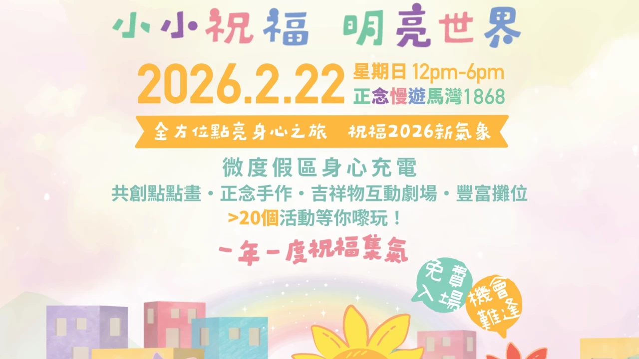 「世界明亮日 2026」將於2月22日在馬灣1868舉行,旨在透過正念、藝術與社區連結,為參與者提供一個身心充電的微度假體驗。活動將包含一系列活動,如正念慢遊、親子手作、舞台表演等,讓大人與小孩都能享受其中。活動內容包括五感當下的正念伸展與靜觀慢步,以及透過藝術與歌聲為心靈帶來洗滌,並面向大海送上對香港的祝福。現場將有「明亮世界點點樂」社區藝術創作、「祝福廣場賀馬年」的祈願活動,以及多樣化的舞台表演,包括泰國水龍舞、音樂Live、吉祥物互動劇場和手偶劇場。此外,還有豐富的攤位活動,如彩繪月球燈、賀年祝福拓印、紙香製作和指紋天賦測試。慈善工作坊則涵蓋紙香製作、水墨畫、鑽石畫、UV水晶膠飾物和非洲鼓等。吉祥物「向心」將提供免費擁抱,現場亦設有趣味遊戲贏取大獎。活動由YUTAKANA豐盛生活冠名贊助。參與者可透過捐款獲得豐盛禮品,包括「豐盛祝福御守」全套(共8款)及「明亮福袋」。捐款滿HK$444或以上可優先登記工作坊,名額有限,先到先得。活動亦提供預購「明亮祝福燈」,可於活動現場取貨。活動詳情可瀏覽 http://salhk.org/wbd2026。