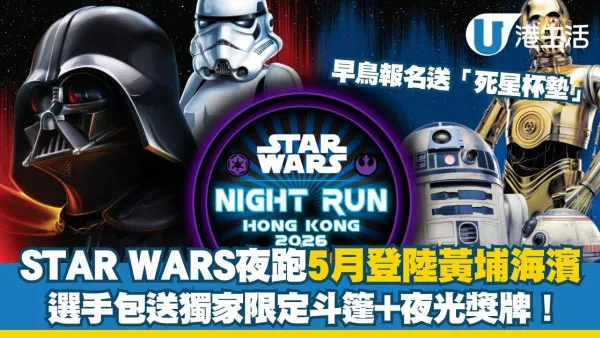 全港首個「STAR WARS Night Run 2026」於今個5月登陸黃埔海濱!屆時除了有1KM Cosplay組和2KM個人組供大家自由報名外,更有STAR WARS主題選手包,送獨家斗篷及夜光獎牌,極具收藏價值呀!凡於3月1日內早鳥報名,更可額外加碼送超罕有「死星岩石杯墊」,咁多位STAR WARS迷記得記低日子報名啦!