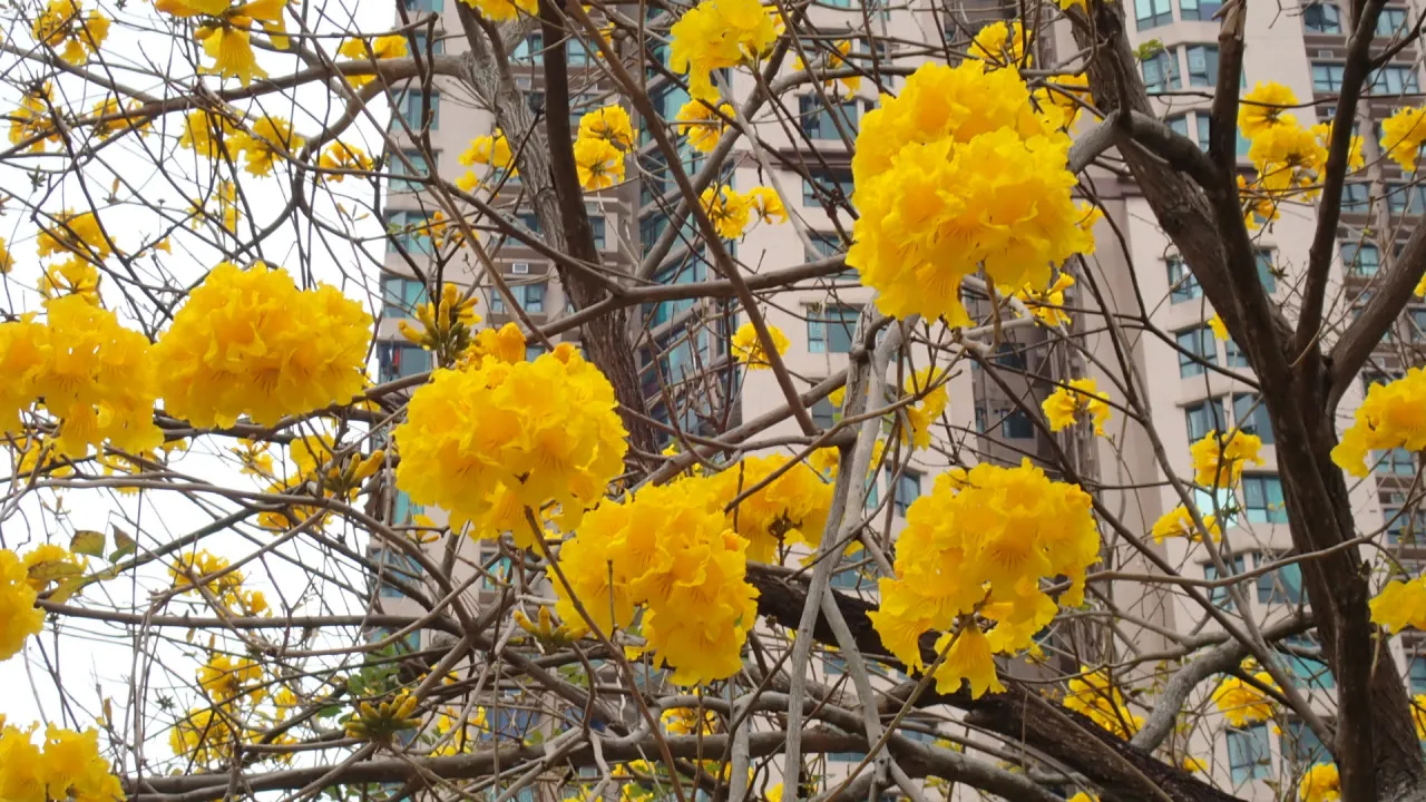 黃花風鈴木,民間又稱「黃鐘木」,屬於落葉喬木,最高可生長至二十米。該樹種以其花形獨特著稱,漏斗狀的花朵猶如金色風鈴垂掛。值得注意的是,黃花風鈴木的花期極短,通常僅能維持一至兩星期,一旦錯過便需再等一年。