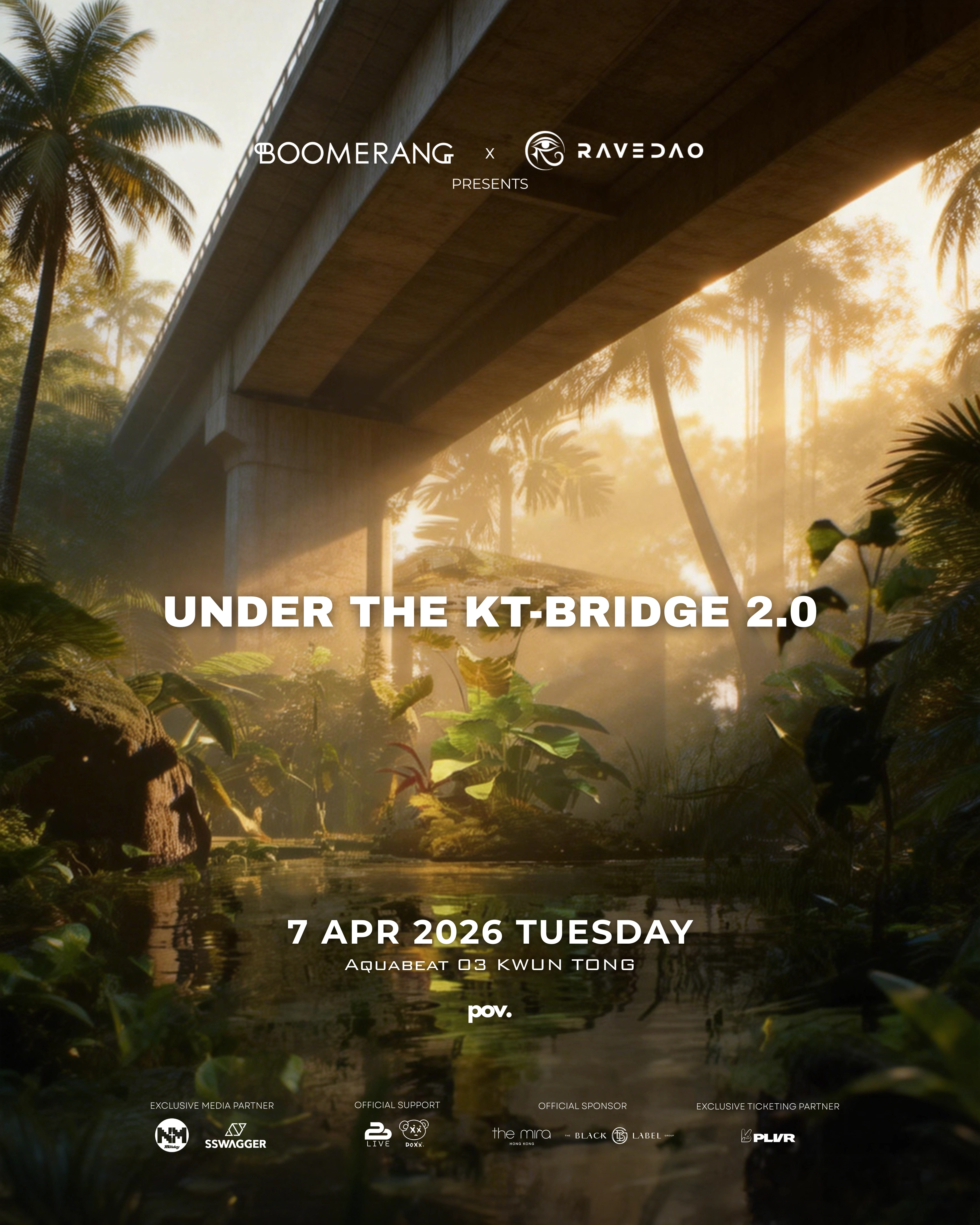 BOOMERANG 與 RaveDAO 將於 2026年4月7日(復活節假期)在觀塘 Aquabeat 03 橋底場地再次舉辦「UNDER THE KT-BRIDGE 2.0」活動。繼首屆活動的成功,本次盛事將延續其地下傳奇,並以更強大的國際陣容和深邃的 Melodic Techno 音樂,重新定義香港的地下派對文化。雖然具體演出陣容尚未公開,但主辦方透露將邀請三組國際級藝人領銜,包括來自全球頂尖電子音樂廠牌的知名製作人,以及在電子樂界擁有「傳奇元老」地位的大師。活動將延續其獨特的工業原始風格,利用觀塘高架橋下的空間,結合頂級音響系統與視覺燈光。備受好評的「Boiler Access」(舞台通行證)也將回歸,讓觀眾能近距離感受 DJ 的魅力。本次活動的入場年齡限制為 18 歲以上。BOOMERANG, RaveDAO, POV 作為主辦單位,致力於將純粹的國際電音能量帶入香港,透過選址非傳統空間和引入高質素國際藝人,打破商業派對的框架,重塑本地地下音樂場景。