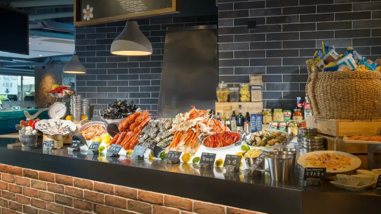 自助午餐主打多款海鮮,有鱈蟹腳、籠仔荷葉蒸原隻鮑魚配時令海鮮、即製泰式精選沙律及芒果糯米飯、燒西冷扒及燒羊脾,即蒸中式點心/鑊氣小炒, 煙三文魚及多款精美沙律、印度天馬尼菜式、 即煮特色湯底粉麵、 精選芝士及凍肉拼盤 (如: 巴馬火腿)、各式冷熱盤、 壽司刺身及時令菜式等。