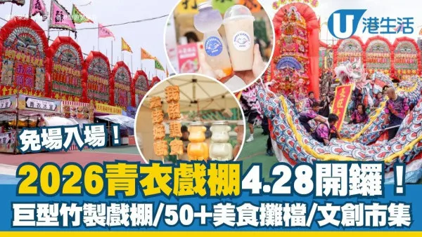 青衣戲棚2026︱年度青衣盛事「葵青戲棚傳統文化節2026」由即日起,分兩個階段於青衣體育會運動場舉行。大家不僅可以近距離欣賞名伶展現傳統戲曲韻味,場外更設有超過50個特色市集攤檔,讓大家盡情掃街品嚐糖蔥餅、砵仔糕等懷舊小食,並搜羅精緻的文創手工藝品。活動採取免費入場,非常適合一家大細或文青週末前往打卡呀!