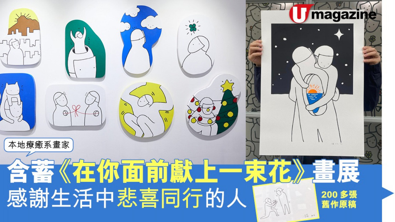 「療癒系」畫家含蓄一向以畫記錄香港人的生活、情緒與故事。新展《在你面前獻上一束花》結集他過去八年的創作,既有20多幅新作,亦有200多張舊作原稿,盛載著大家經歷疫情及社會變化的情緒,以及對悲喜同行的人的感謝。