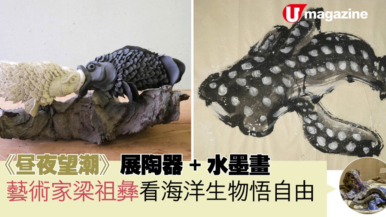 身兼新聞攝影記者的藝術家梁祖彝,多年來以「魚」為主題進行創作,由陶器到水墨畫中,漸見更多海洋生物,如蛸、鯨鯊、魷、長腳蟹等。最新個展《昼夜望潮》展出陶器和水墨畫的新舊作,寓意梁祖彝如同漁夫在觀察潮汐,傳遞一種自由的感覺。
