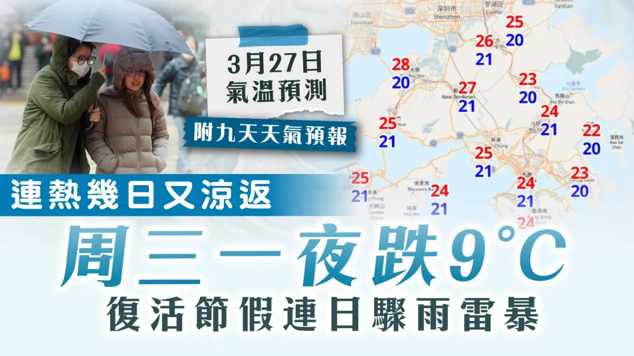 天文台展望明日(26日)日間短暫時間有陽光及炎熱,市區氣溫約攝氏24至30度,上水、流浮山、石崗等新界地區高達33度,大致多雲,有一兩陣驟雨,早晚有霧。本周三(27日)氣溫稍為下降,市區約21至24度,大致多雲,有一兩陣微雨,早上有薄霧。本周四(28日)短暫時間有陽光,市區22至27度。