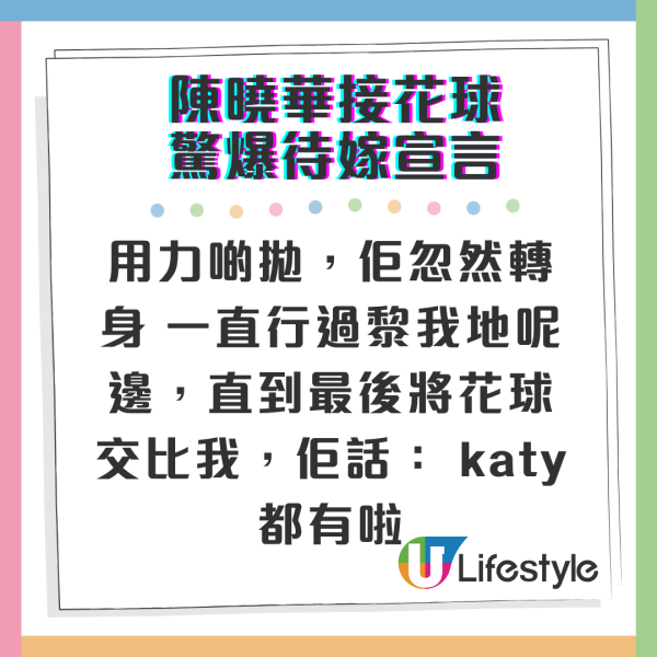 陳曉華日前再在IG貼出席閏蜜兼大嫂的婚禮的相片,而:「祝賀陳生陳太新婚快樂💓花球環節我企開一二邊,期待花球拋到下一位準備結婚嘅姐妹,大聲同新娘講向中間用力啲拋,佢忽然轉身 一直行過黎我地呢邊,直到最後將花球交比我,佢話: katy 都有啦差你一個咋」令她十分感動。