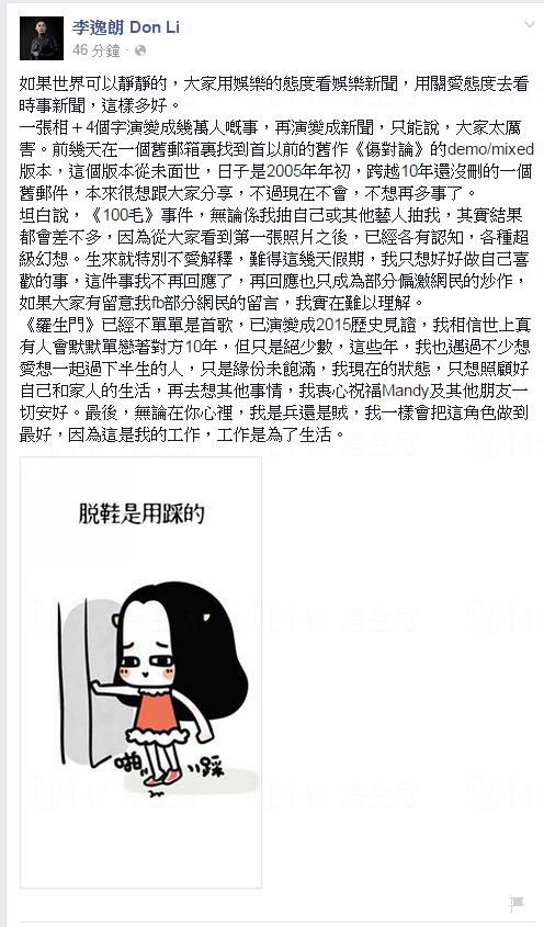 剛才同大家講過,尋晚Mandy 蔣雅文零晨兩點出咗個Post澄清佢同Don李逸朗無拍過拖,叫大家畀返正常生活佢,Don其實都講過佢同Mandy無嘢,不過大部分網民都撐Mandy,覺得Don借Mandy抄作上位,(詳看《網民鬧李逸朗抽水表達愛意 女神蔣雅文爆發深夜出Post澄清》),群情洶湧,Don啱啱又回應咗,佢話:「一張相+4個字演變成幾萬人嘅事,再演變成新聞,只能說,大家太厲害。」,再話邊有咁多《羅生門》故事,即指係大家自己亂諗搞大件事!最後佢仲祝福Mandy,同埋話會繼續做好佢嘅「角色」!