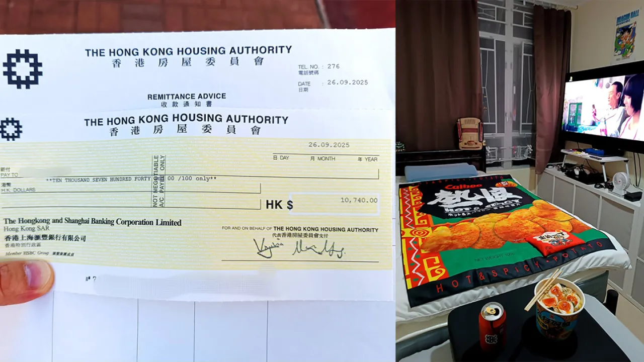 從樓主分享照片可見,單位雖小但實用空間充足,足夠放雙人床、大電視與組合櫃。他又指,寬敞戶搬遷津貼支票金額為$10,740,直言「真係勁開心!」