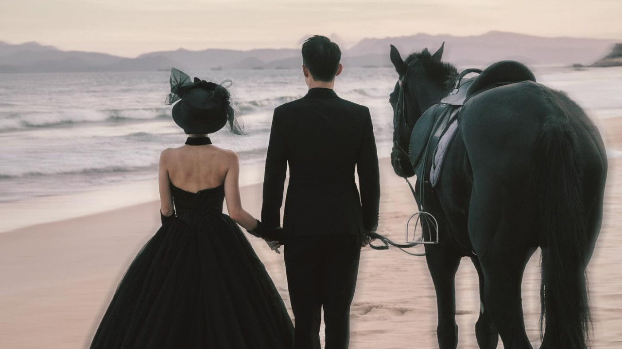 破格全黑主題婚照曝光 未婚妻黑色婚紗配黑馬