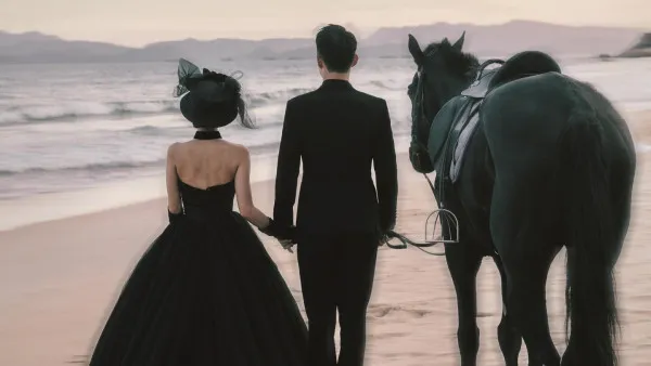 容天佑與未婚妻的婚照風格相當破格,以全黑主題呈現。兩人選在日落下的沙灘取景,容天佑身穿黑色西裝,未婚妻則以黑色露肩拖地婚紗示人。其中一張照片中,戴上黑超的二人背對鏡頭,牽手走向海邊,一匹黑色駿馬跟隨在旁,畫面充滿電影感和氣勢。