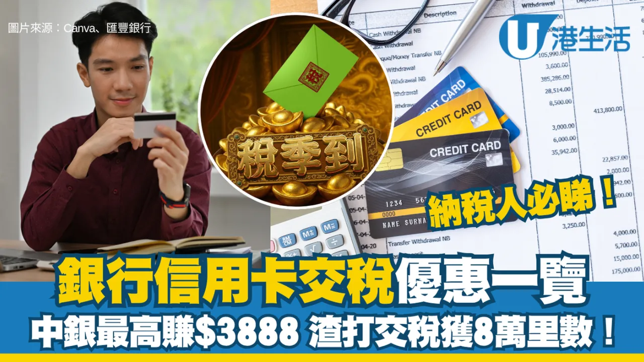 交稅優惠2025|2025/26稅季來臨,各大銀行紛紛推出信用卡交稅優惠!其中渣打國泰Mastercard交稅可賺8萬里數、中銀最高獲$3,200現金回贈、東亞信用卡交稅亦享最高4萬里賞,輕鬆繳稅之餘又能慳到盡!即睇信用卡交稅優惠攻略,找出最高回報的繳稅方案。