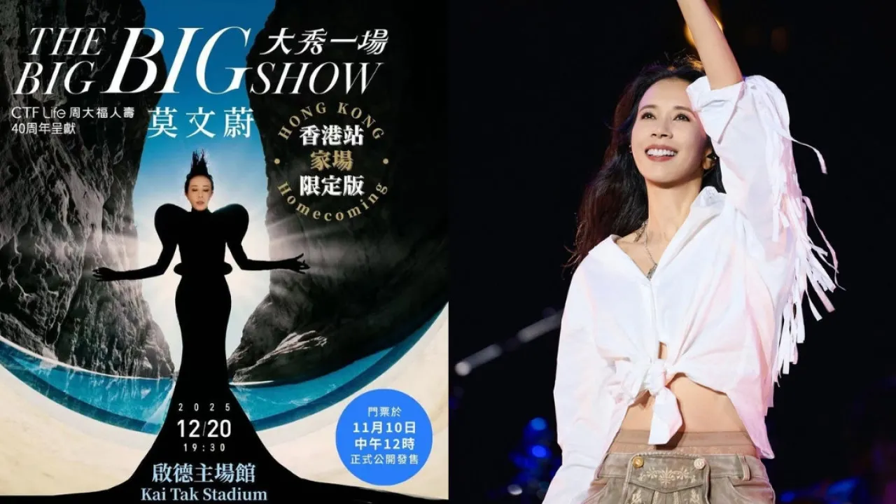 莫文蔚《THE BIG BIG SHOW 大秀一場 香港站「家場」限定版》演唱會將於2025年12月20日晚上7時30分在香港啟德主場館舉行。