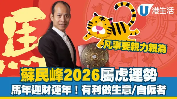 玄學家蘇民峰師傅在其YouTube頻道「峰回運轉」公布了十二生肖2026年的運程預測,2026年為馬年(丙午年)從新曆2026年2月17日開始,至到2027年2月5日結束。蘇民峰師傅預測,肖虎者2026馬年的財運高居第二位,對做生意的人以及自僱一族特別有利!然而,由於今年完全沒有吉星拱照,因此必須事事親力親為,凡事都靠自己努力把握!