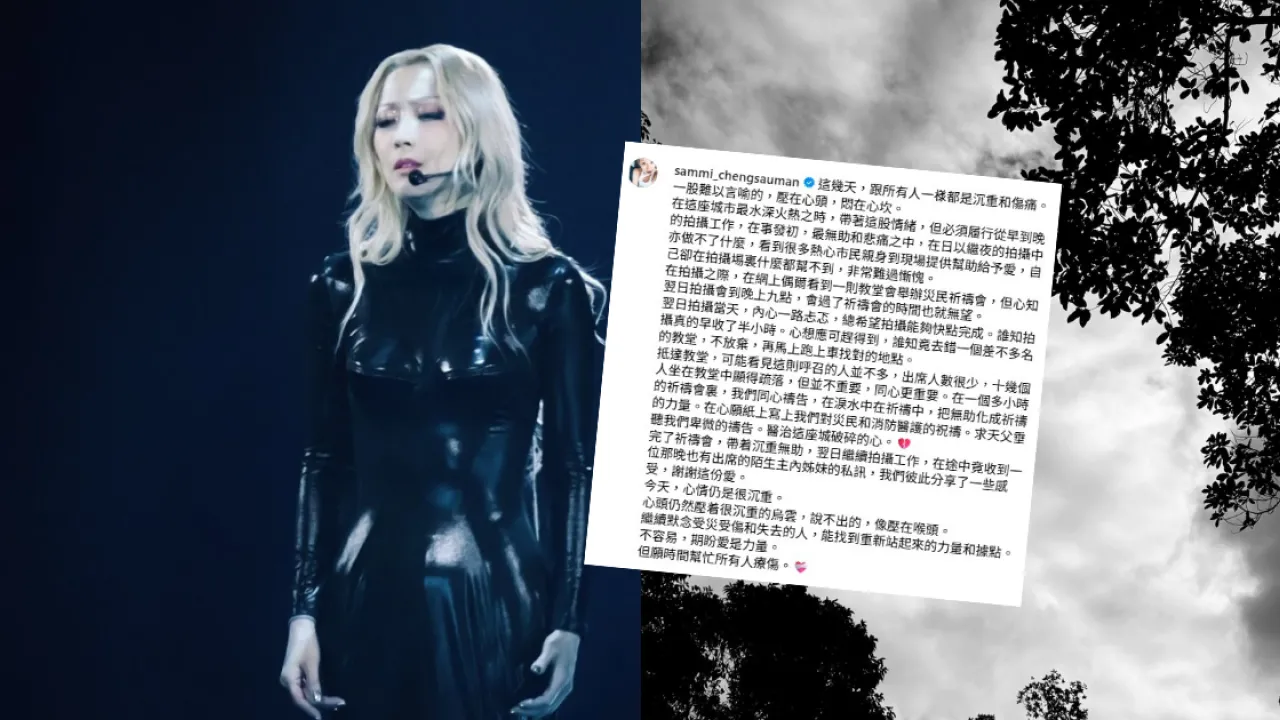 大埔宏福苑五級大火造成至少過百人死亡,是香港近年來最嚴重的住宅火災,全城陷入悲劇噩耗。演藝界人士同樣心繫災情,天后鄭秀文(Sammi)近日透過Instagram社交平台撰寫長文,表達對大埔奪命火災事件的沉重心情與感受,透過自己在拍攝期間難抽身援助,坦言「非常難過慚愧」,幸而不放棄,終趕上災民祈禱會,為受災、受傷和失去的人默念祝禱。