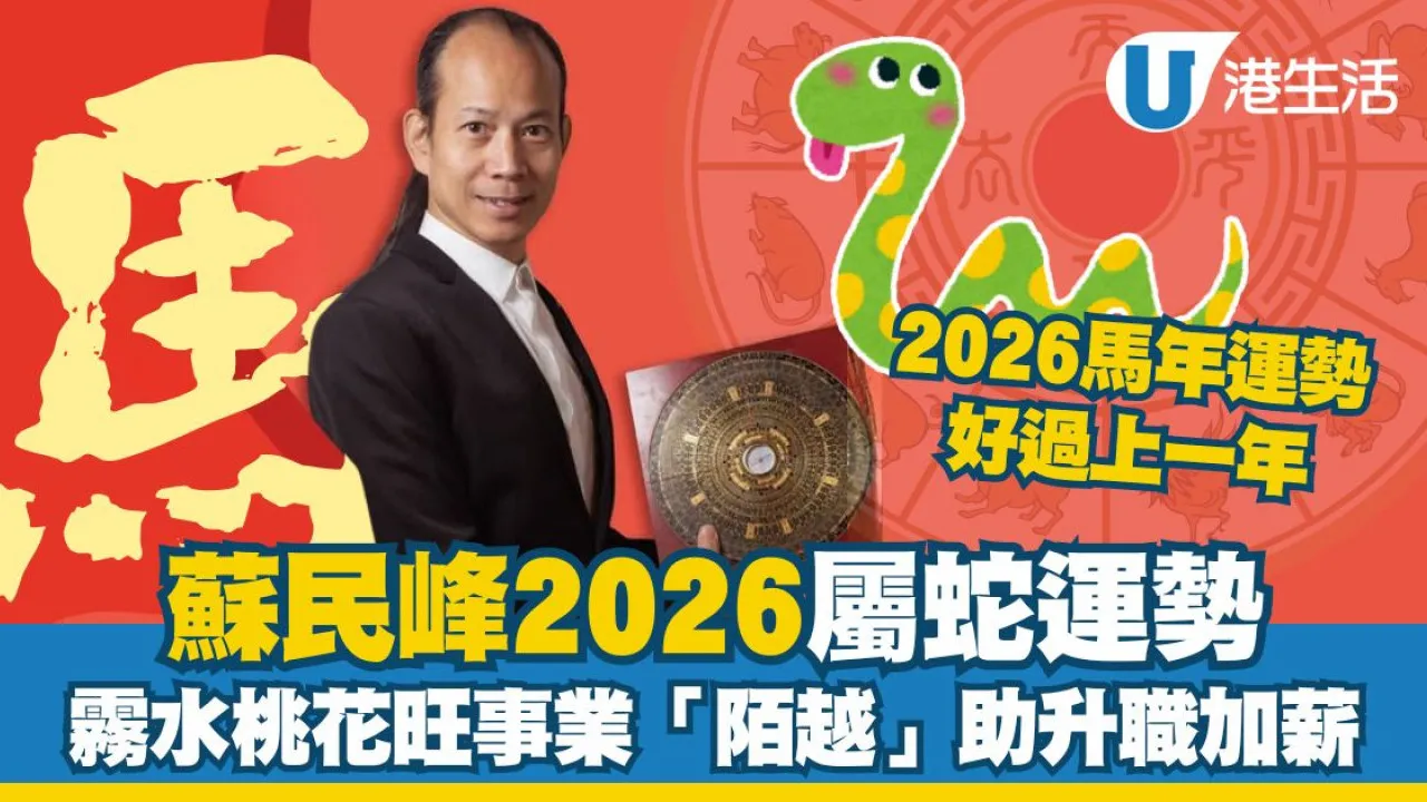 蘇民峰師傅表示,肖蛇者2026年的運勢將明顯優於2025年,尤其是秋冬天出生屬蛇的人,如果能夠擺脫2025年犯太歲的情緒/感情煩惱,運勢可算進取。踏入2026年若能積極進取,更是可以發揮實力的一年。