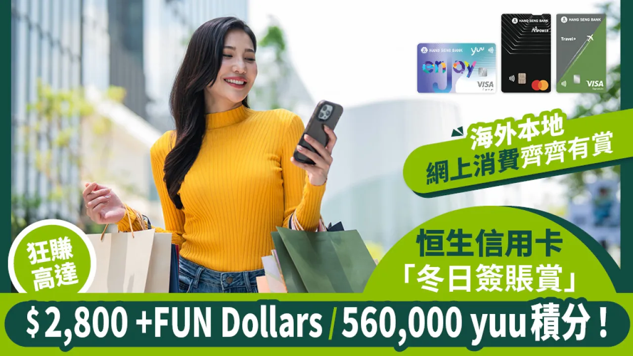 又到一年錢錢流失速度最快的年尾,周末要北上、放假要去旅行,又要去澳門睇Show,還有一班朋友食飯聚會⋯⋯不過只要你有恒生信用卡,就可以將以上消費全部變成多重獎賞,現在登記「冬日簽賬賞」,就可以賺高達$2,800 +FUN Dollars / 560,000 yuu積分 ,成功「回水」!