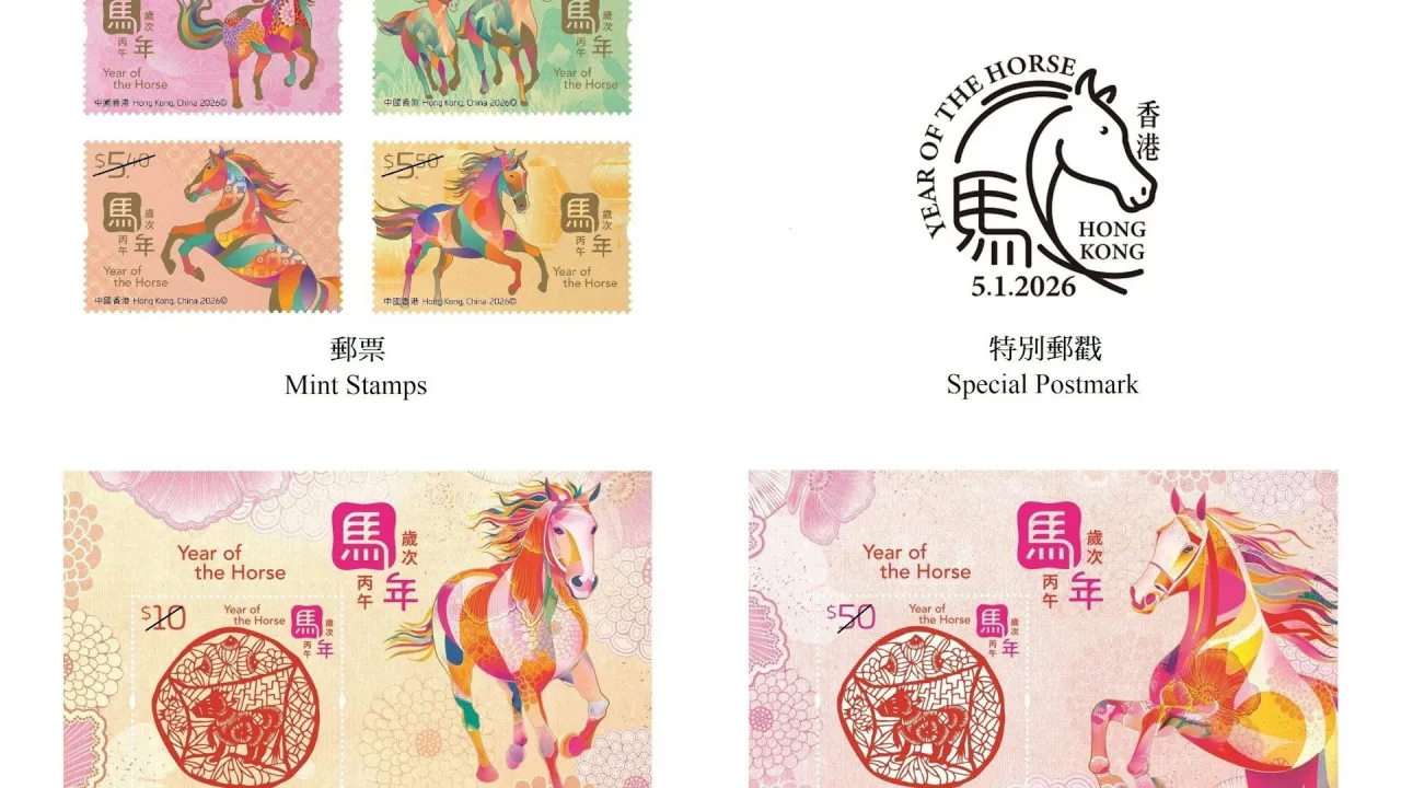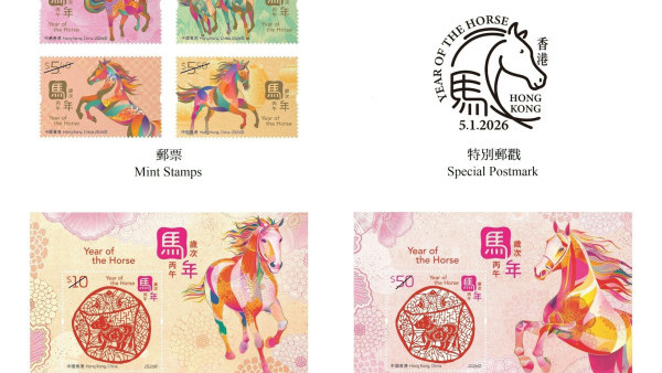 香港郵政將於「歲次丙午」(馬年)首日,即2025年1月5日,發售馬年生肖郵票及相關郵品。新系列包括4枚郵票、2款郵票小型張,均以駿馬的不同動態為設計主題。其中,10元郵票小型張及50元鐳射剪紙小型張分別以年花圖案點綴馬身,展現節慶氣氛。50元剪紙款更採用鐳射切割技術,精細呈現馬匹剪影。